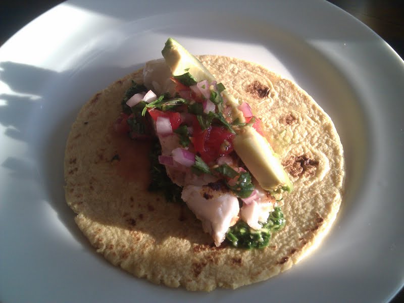 Tonight, we made a new (to us) version of fish tacos. We cut up some tomatoes, onion, and cilantro, and added a splash of lime for some pico de gallo, and I blended up some more cilantro, with a good bit of garlic, salt, and some olive oil to make a sauce.